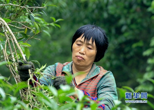 28日,慧苑坑一處生態茶園,一名女工正在采摘春茶。當前,武夷巖茶進入采摘、做青旺季。新華網 肖和勇 攝