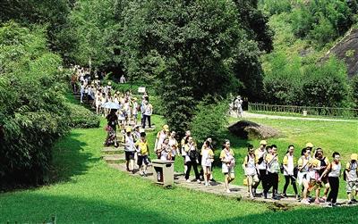 7月5日,來自武漢參加夏令營的小朋友在武夷山景區游覽。 進入暑期,武夷山迎來暑期旅游高峰,眾多游客來到空氣清新、生態優美的武夷山旅游度假,領略大自然風光。(新華社記者 張國俊 攝)