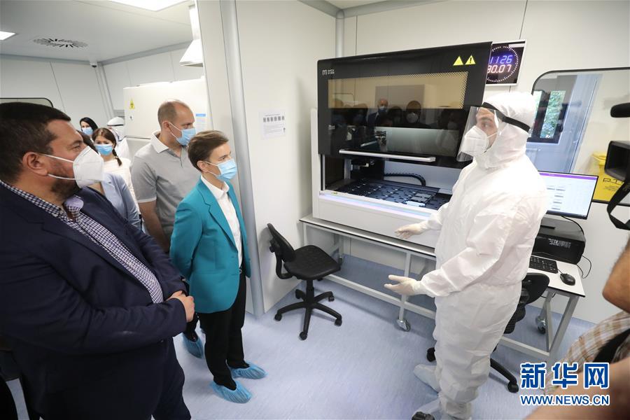 7月30日,在塞爾維亞南部城市尼什,塞爾維亞總理布爾納比奇(右二)視察新落成的“火眼”病毒檢測實驗室。 塞爾維亞第二座由中國企業參與設計并捐贈設備的“火眼”病毒檢測實驗室落成儀式30日在尼什舉行。 新華社發(塞爾維亞政府供圖)