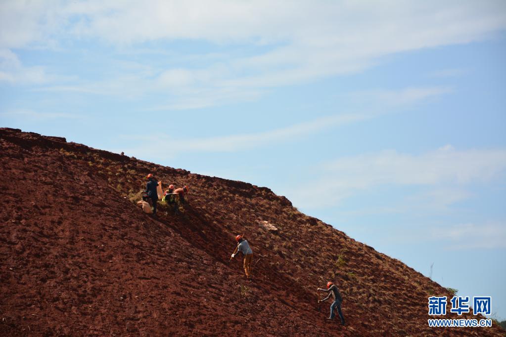 2019年3月11日,在剛果(金)盧阿拉巴省科盧韋齊市紫金礦業旗下穆索諾伊公司礦區內,工作人員對礦區排土場進行綠化工作。新華社發