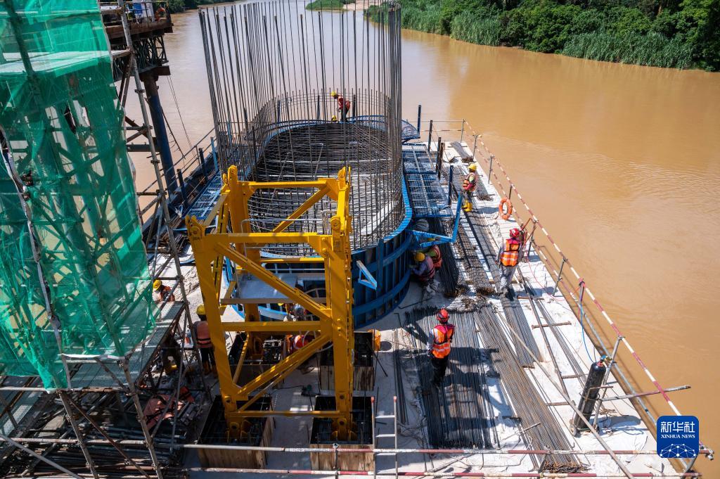 11月9日,在馬來西亞彭亨州淡馬魯縣,工人在馬東鐵項(xiàng)目30號(hào)橋工地上工作(無人機(jī)拍攝)。新華社記者 朱煒 攝