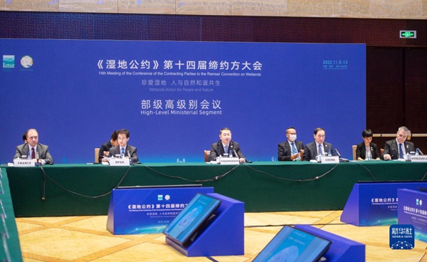 這是11月6日在湖北武漢拍攝的《濕地公約》第十四屆締約方大會(huì)部級(jí)高級(jí)別會(huì)議現(xiàn)場(chǎng)。新華社記者 伍志尊 攝 國(guó)家林業(yè)和草原局副局長(zhǎng)譚光明說(shuō),“武漢宣言”是一份凝聚各方共識(shí)、展示全球意愿的重要文件,向世界宣告了中國(guó)加強(qiáng)生態(tài)文明建設(shè)、推進(jìn)濕地保護(hù)事業(yè)高質(zhì)量發(fā)展的決心和責(zé)任。