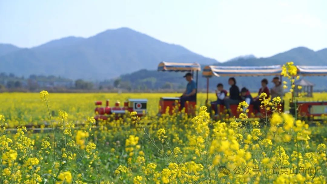 來(lái)到五夫朱子雕像廣場(chǎng)前,500多畝的油菜花田如金色海洋,微風(fēng)吹拂時(shí)形成層層波浪,遠(yuǎn)處青山與藍(lán)天白云為背景,游客們徜徉在花海中,或拍照留念,或駐足觀賞,盡情享受春日的美好時(shí)光。景區(qū)還設(shè)置了“開(kāi)往春天的小火車(chē)”,游客們乘坐其上,穿梭花海,近距離感受花香與田園詩(shī)意。