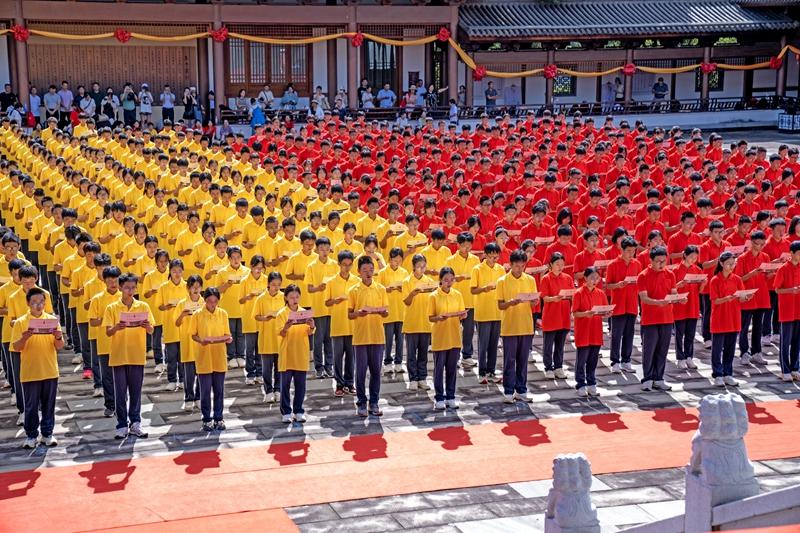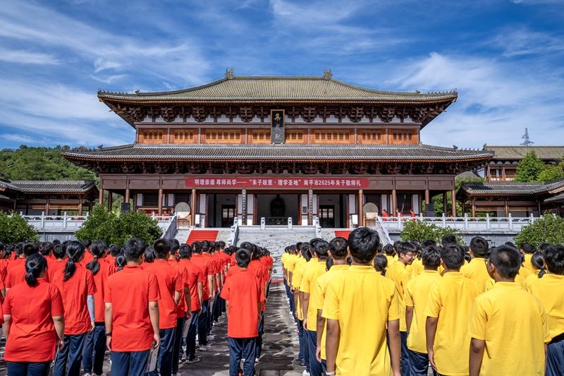 “明理崇德 尊師尚學——‘朱子故里·理學圣地’南平市2025年朱子敬師禮”活動在建陽考亭書院舉行 吳大灼 攝 9日上午,“明理崇德 尊師尚學——‘朱子故里·理學圣地’南平市2025年朱子敬師禮”活動在建陽考亭書院舉行。建陽一中650余名師生參加活動。 在考亭書院集成殿,學生們行鞠躬禮,緬懷中華先賢;學生代表向老師呈敬師帖,表達尊師心聲;在行釋菜禮環節,學生代表將芹菜、蓮子、紅豆、棗子、桂圓、肉干六樣各有寓意的果蔬菜羹敬送給老師,老師回贈《白鹿洞書院揭示》卡片;最后,學生們齊誦朱熹《白鹿洞書院揭示》,弘揚尚學之道。